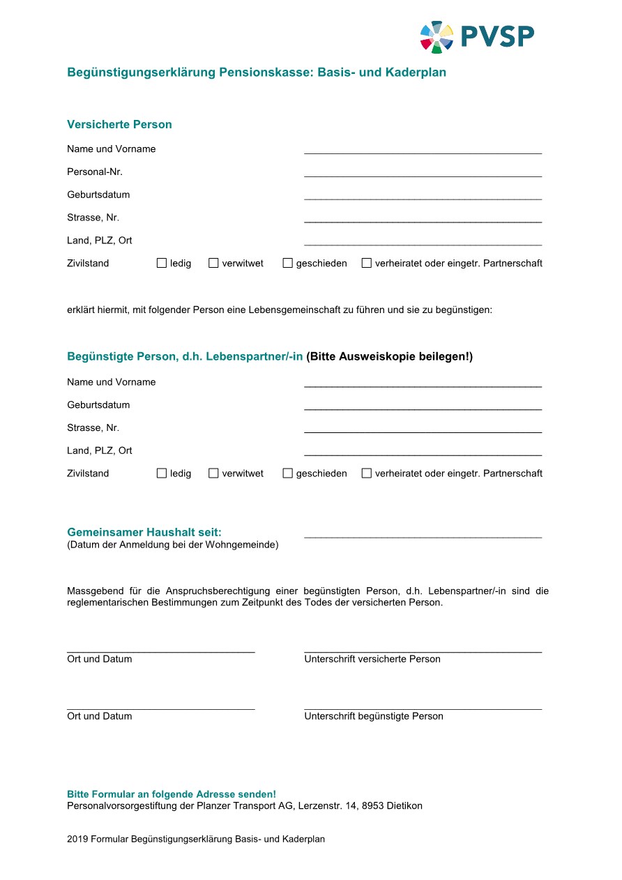 Als Ihre Vorsorgestiftung können wir nicht für Folgen haften, die sich aus einem falschen Informationsstand über Zivilstand oder Begünstigung ergeben. Details dazu finden Sie in unserem Merkblatt «Begünstigungserklärung Basis- und Kaderplan».