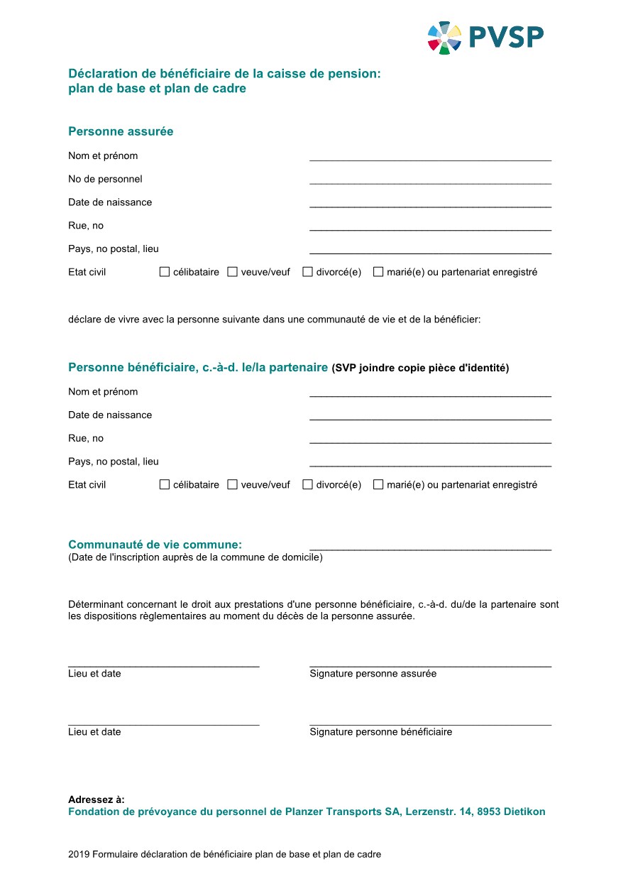 Si une communauté de vie existe, vous avez la possibilité de remplir une déclaration de bénéficiaire (voir ci-dessous) et nous l’envoyer. Si lors du décès d’un assuré de la PVSP, une telle déclaration en faveur du partenaire existe, la personne survivante a droit à une rente de conjoint. Ce faisant, les mêmes dispositions que pour le conjoint sont valables.