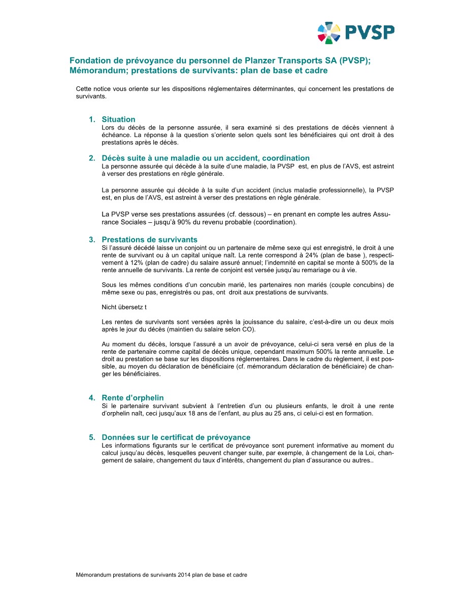Une personne assurée de la PVSP ou une personne bénéficiaire d’une rente d’invalidité vient à décéder avant la mise à la retraite, nous versons l’avoir de vieillesse, qui est disponible au moment du décès (limitation lorsqu’il y a aussi un versement en même temps d’une rente de survivant), dans ce cas-là nous parlons de capital de décès. Si la personne décède après la mise à la retraite, le capital de décès est supprimé.