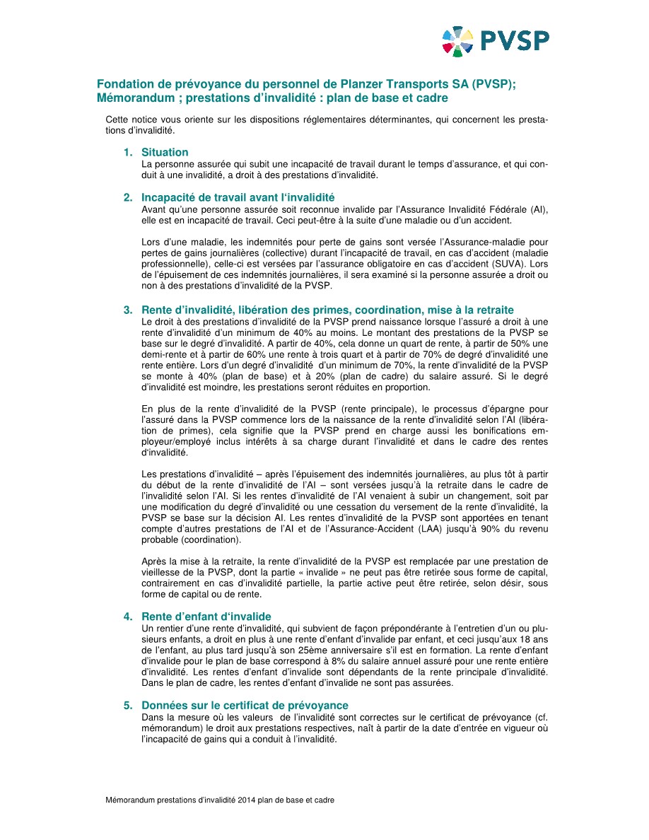 La rente d’invalidité de la PVSP se monte à 50% du salaire assuré, lorsqu’une rente entière est allouée par l’AI. La rente d’enfant d’invalide se monte à 8% du salaire assuré, respectivement à 20% de la rente d’invalidité.