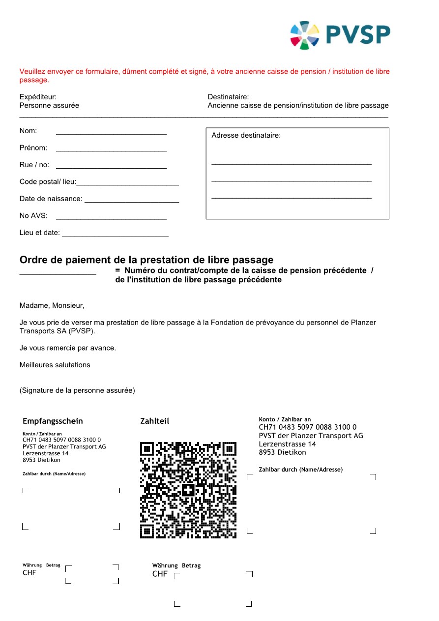 Votre avoir de la caisse de pension (nommé: prestation de sortie) de votre ancien employeur doit nous être apporté ; ceci ne se passe pas automatiquement. Au moyen du formulaire ci-contre « transfert de libre-passage“, donnez l’ordre à celle-ci, d’effectuer le transfert.