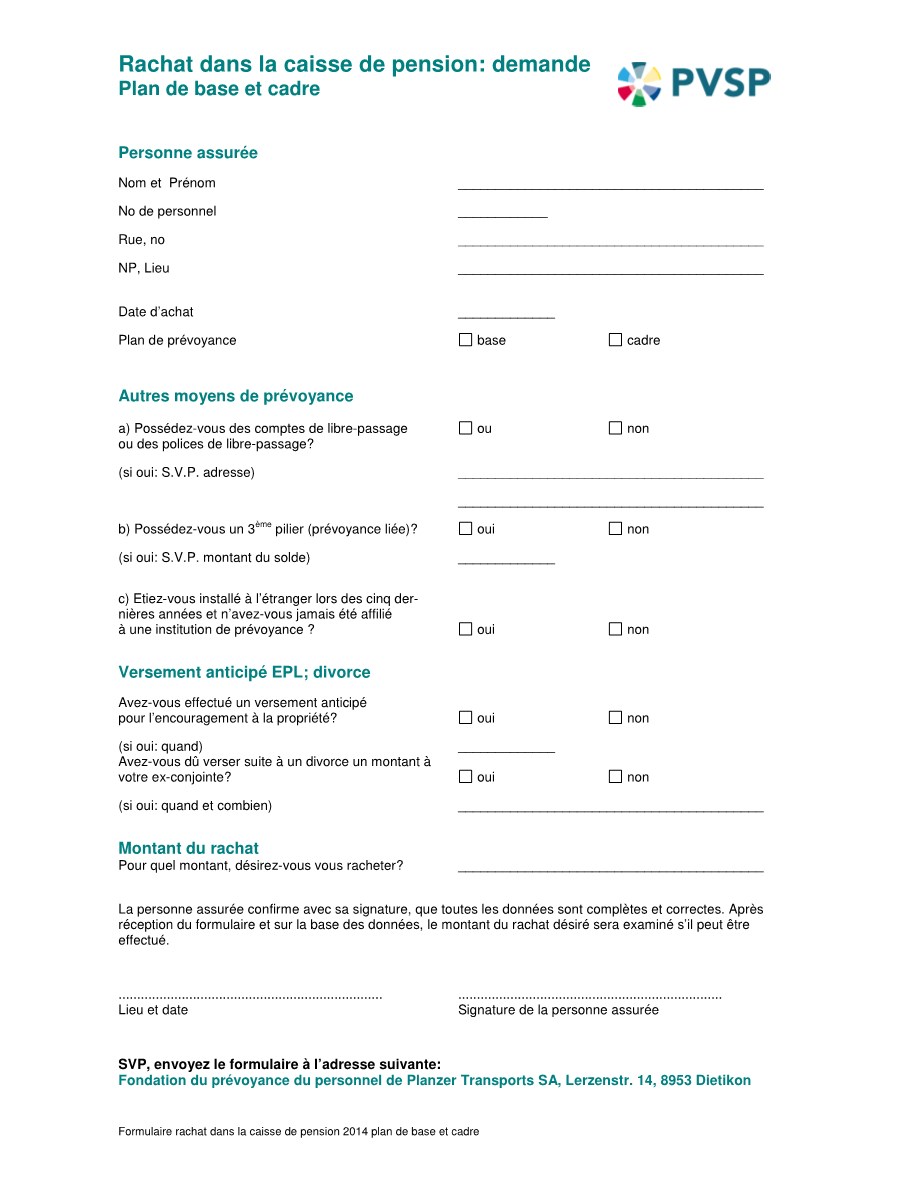 Vous pouvez vous racheter dans la PVSP. Dans votre certificat de prévoyance, sous la rubrique « rachat maximum possible », vous trouvez ce montant qui peut nous être versé une seul fois par an. Par contre, est-ce que vous pouvez vous racheter pour ce montant total, ceci dépend aussi d’autres montants de prévoyance que vous pourriez posséder. Afin de pouvoir recevoir une réponse à cette question, nous vous prions de bien vouloir remplir le formulaire de « Rachat dans la caisse de pension : demande » et de nous le soumettre.