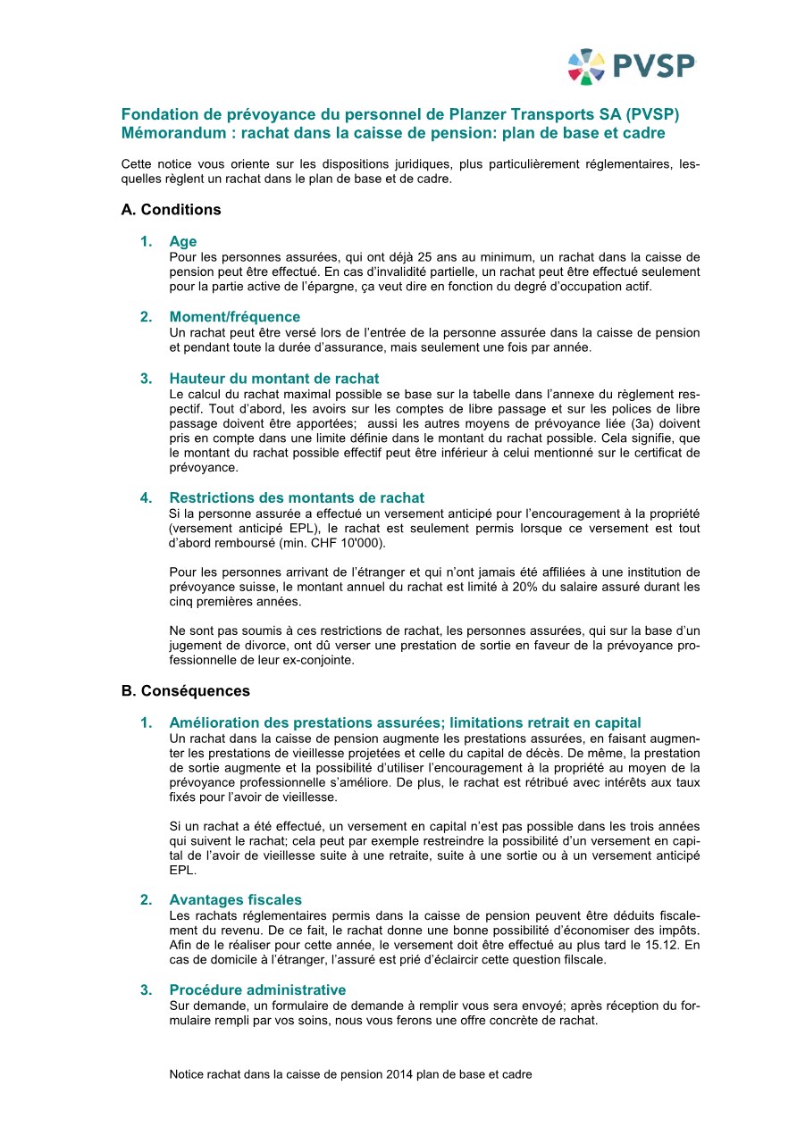 D’autres informations sur les conditions et les effets d’un rachat sont à votre disposition dans le mémorandum « rachat dans la caisse de pension : plan de base et cadre ». Par exemple, si vous avez, dans le cadre d’un divorce, cédé une partie de votre avoir de prévoyance, vous avez la possibilité de racheter ce montant cédé dans sa totalité. Plus d’informations dans le mémorandum « divorce ».