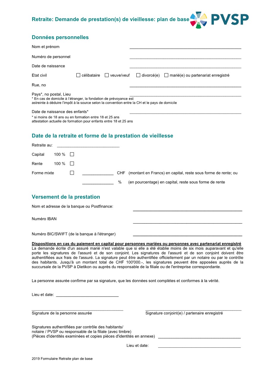 Dès que vous avez pris votre décision, remplissez SVP le formulaire « retraite : demande de prestation(s) de vieillesse plan de base » et envoyez-le nous au plus tard 2 mois avant la retraite effective.