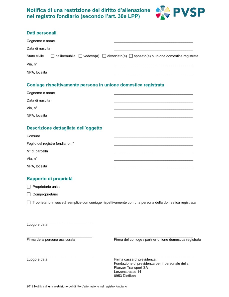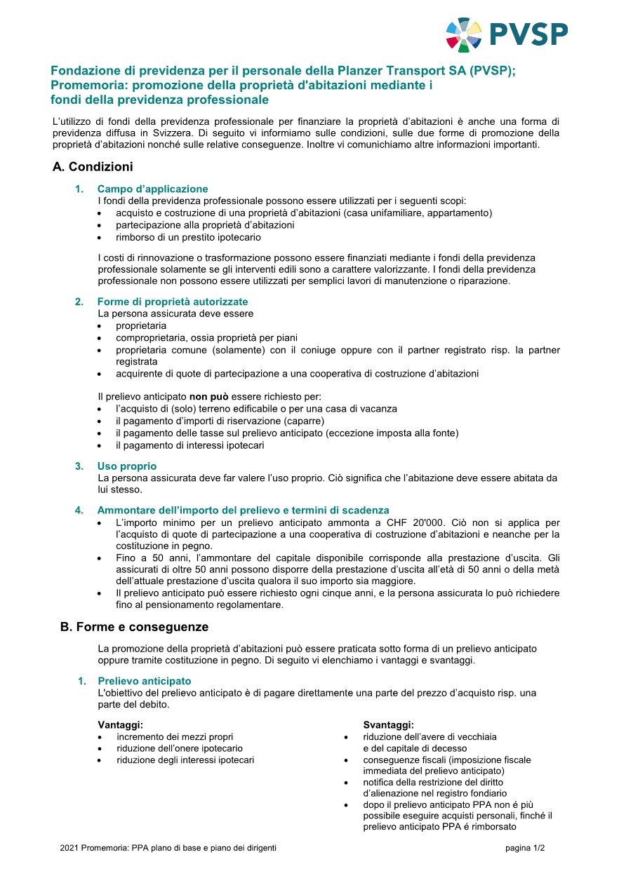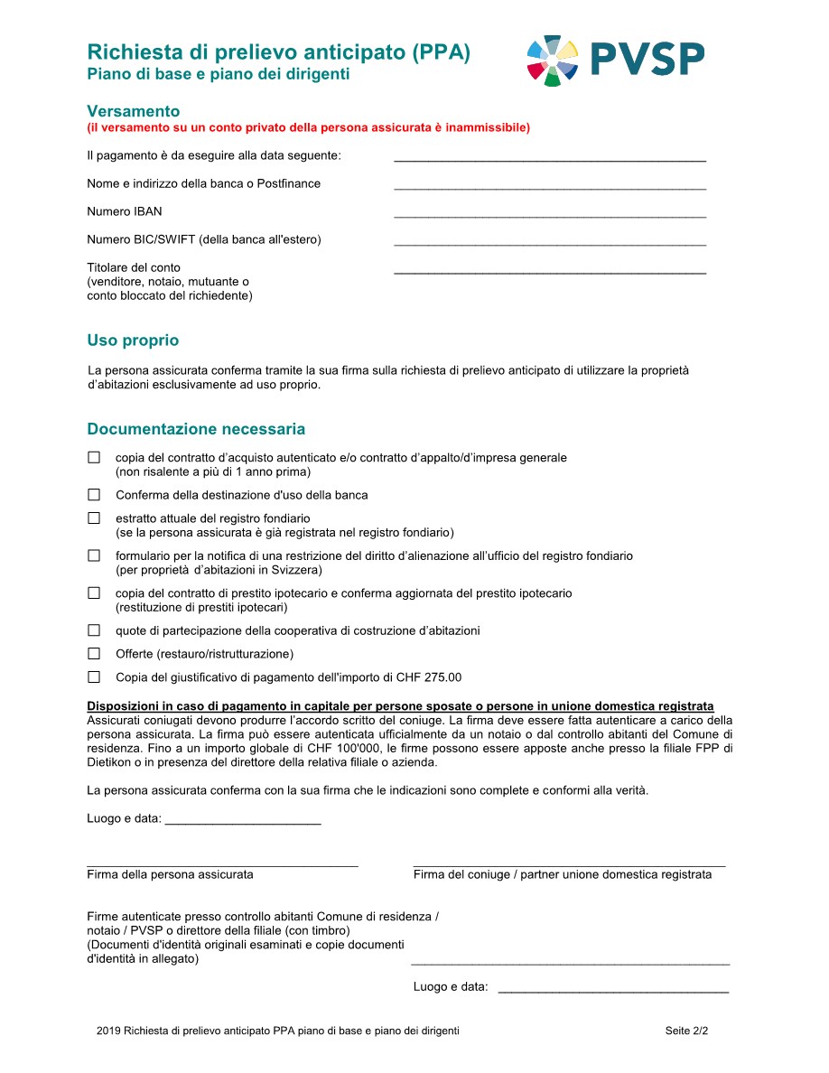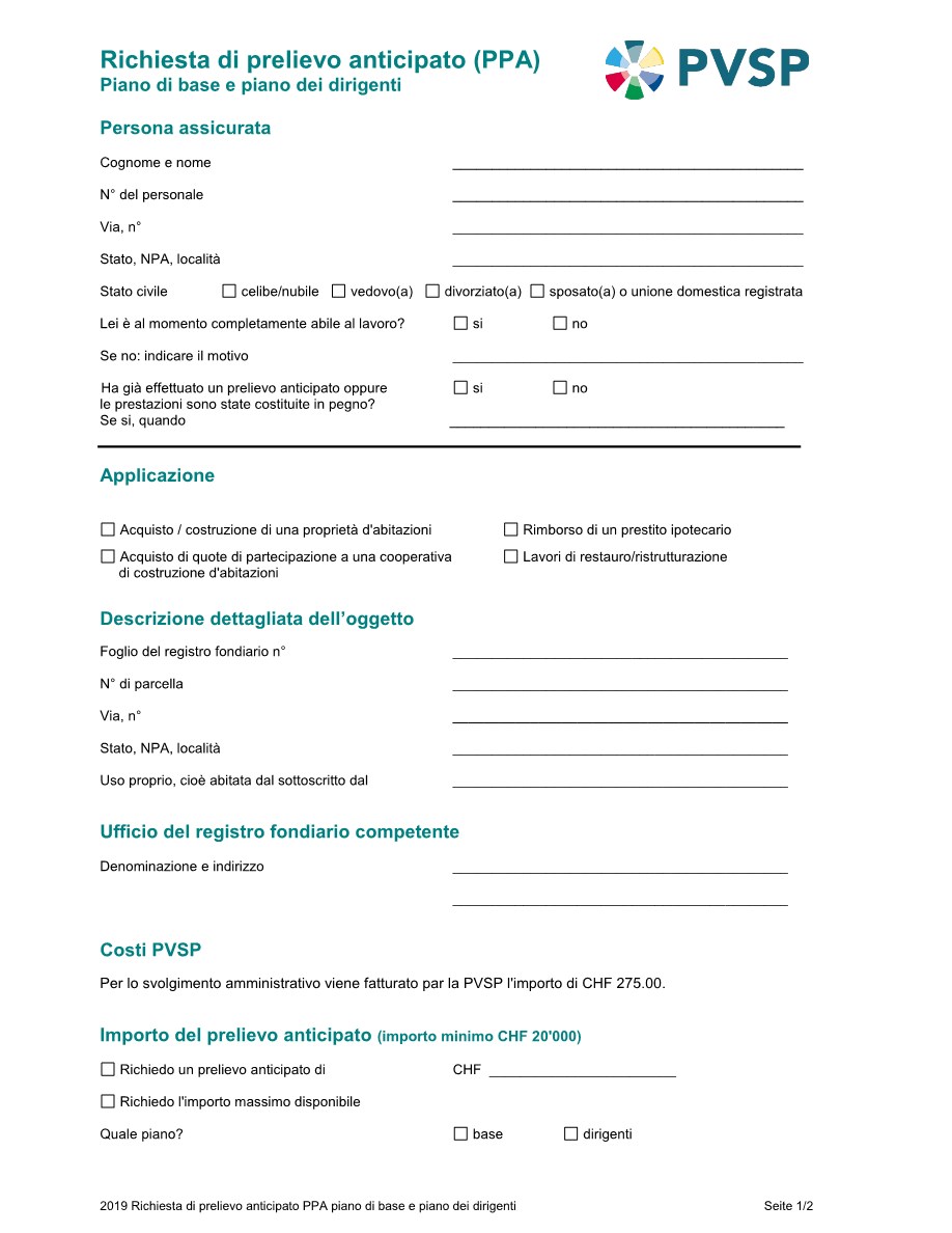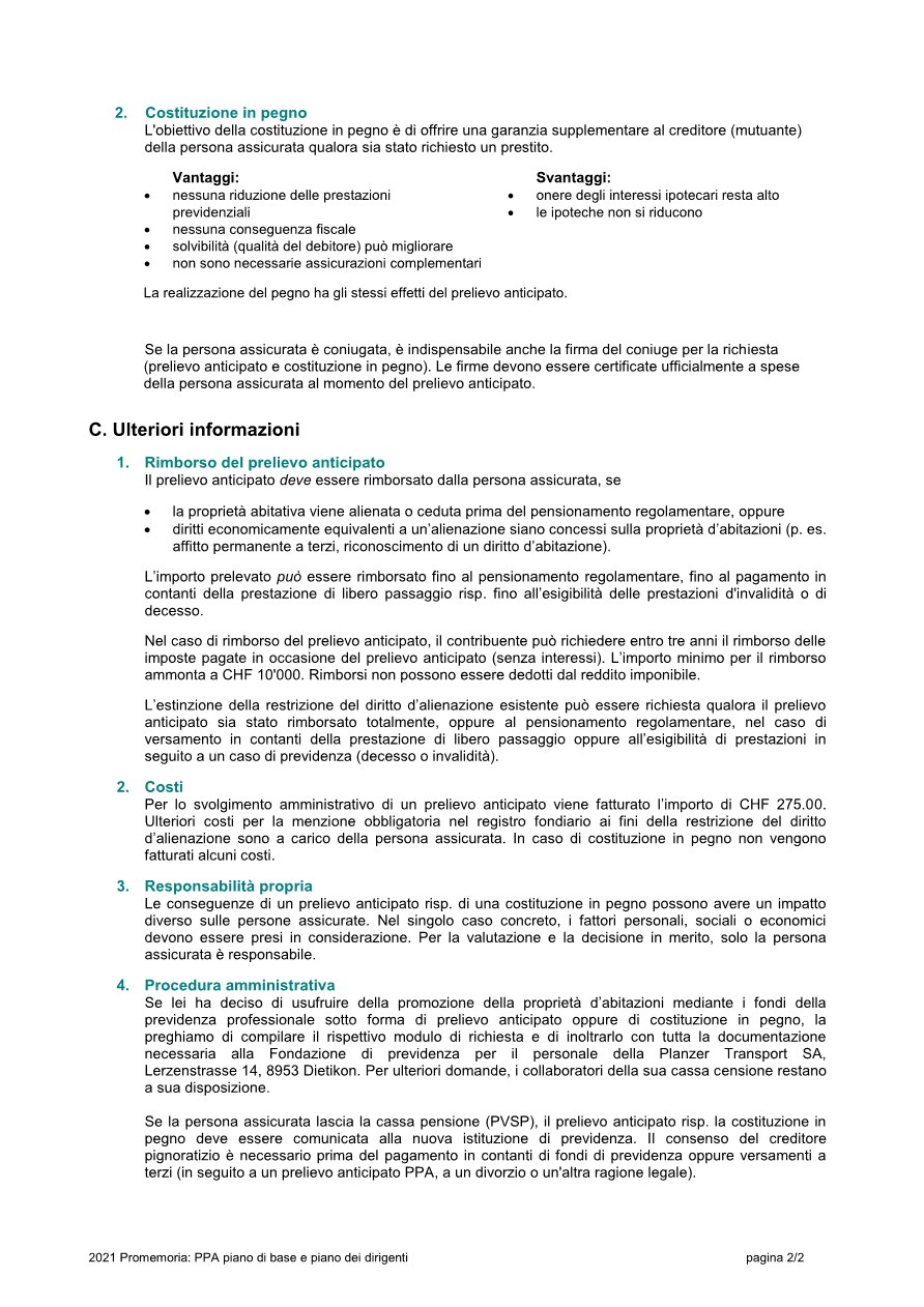 Informazioni supplementari in merito alle premesse, conseguenze, vantaggi e svantaggi di un prelievo anticipato, costituzione in pegno e ipoteca /prestito le potete leggere sui nostri promemoria che potete scaricare alla rubrica a lato. Inoltre ci sono i moduli di richiesta come pure il modello di lettera per la richiesta della menzione di una restrizione del diritto d'alienazione al Registro Fondiario.