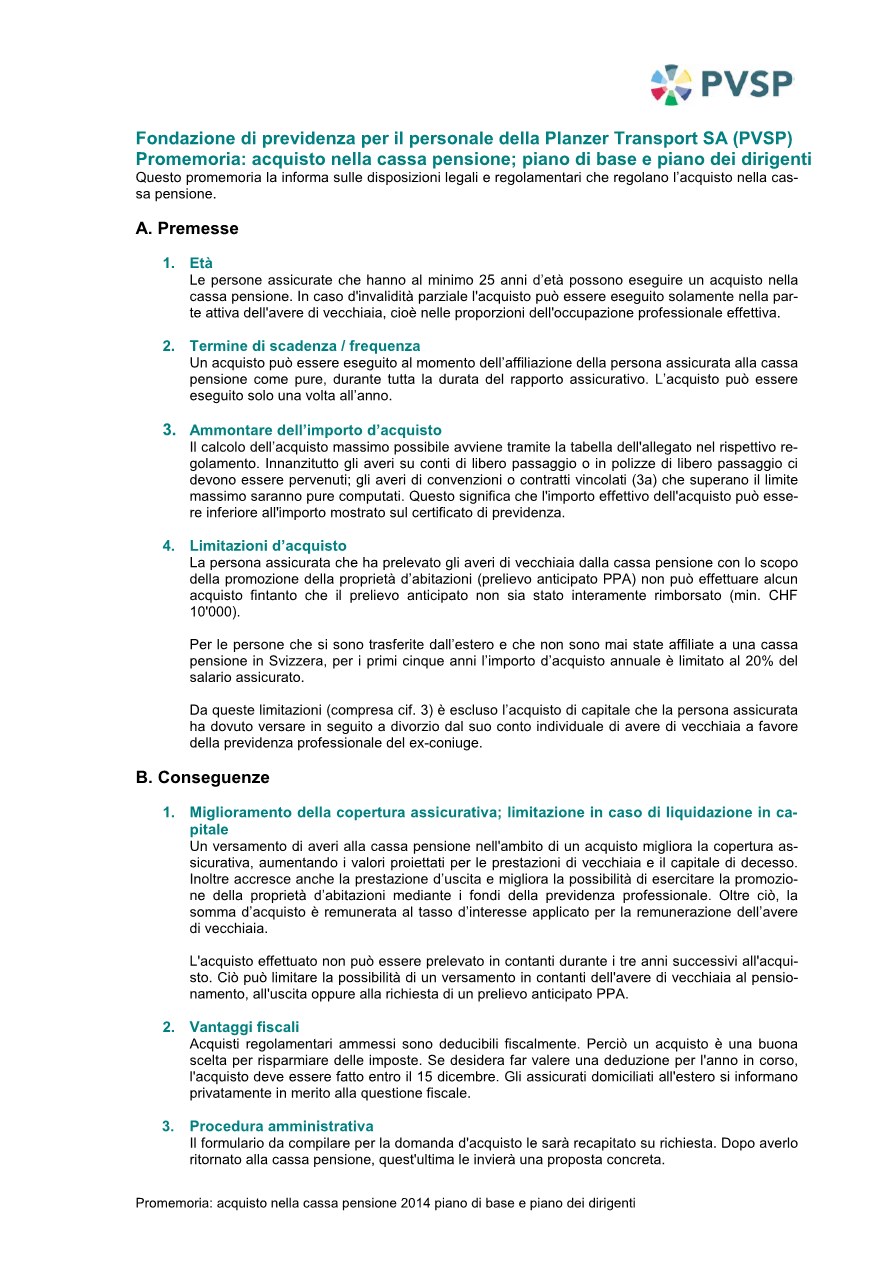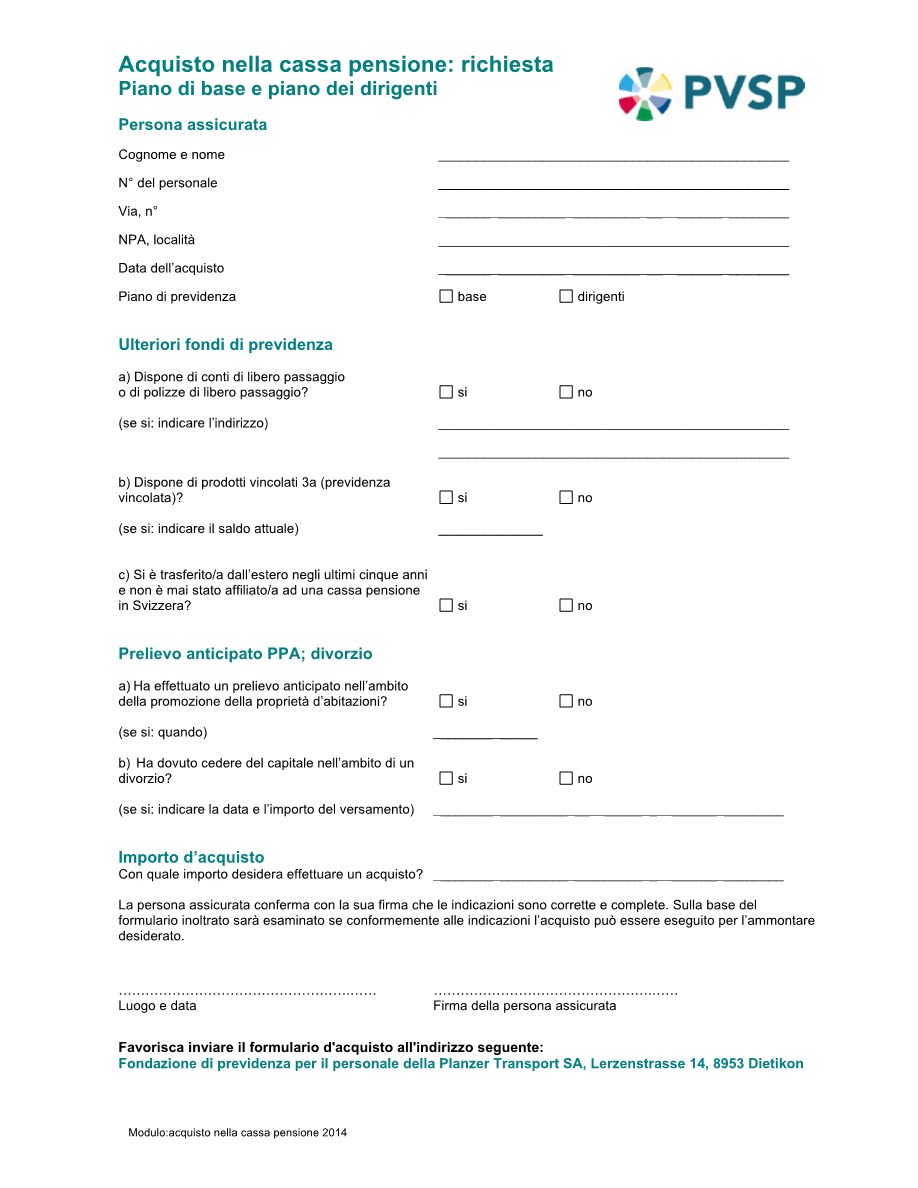 Voi potete eseguire un acquisto nella PVSP. Alla voce « Somma d’acquisto massima ammessa» del vostro certificato di previdenza trovate l’importo massimo che potete versare una volta all’anno. Se vi è permesso di apportarne la totalità, questo dipenderà da eventuali e altri fondi di previdenza che possedete. Per saperne di più voi dovete inviarci il modulo di richiesta «Acquisto nella cassa pensione; piano di base e piano dei dirigenti» debitamente compilato.