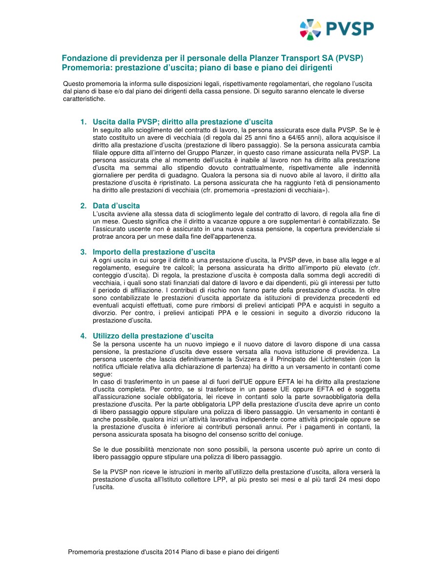 Sul nostro promemoria «Prestazione d’uscita; piano di base e piano dei dirigenti» trovate altre informazioni utili. Per altre domande e spiegazioni restiamo personalmente a vostra disposizione.