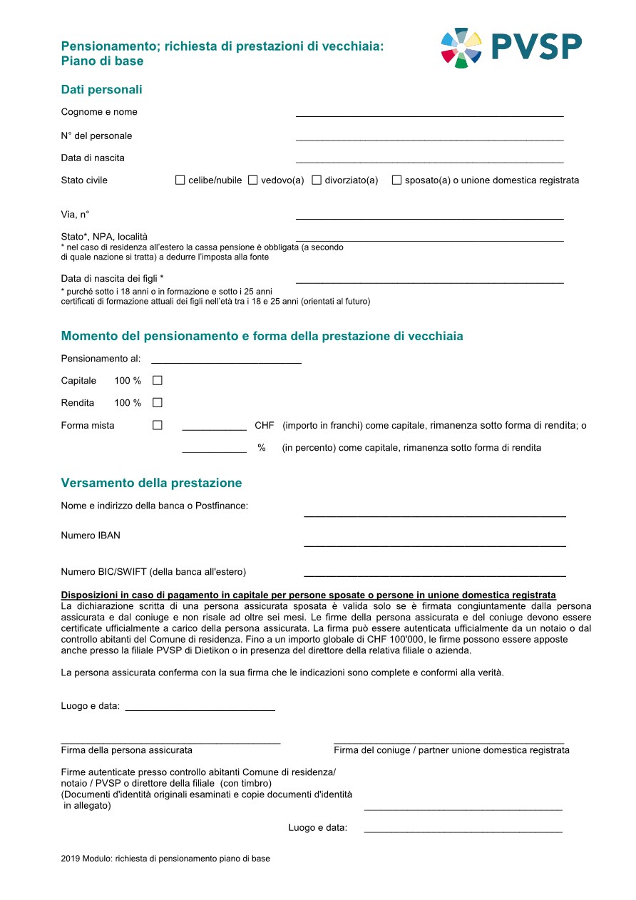 Quando avete preso la vostra decisione, allora inviateci il modulo «richiesta di prestazioni di vecchiaia; piano di base» debitamente compilato.
